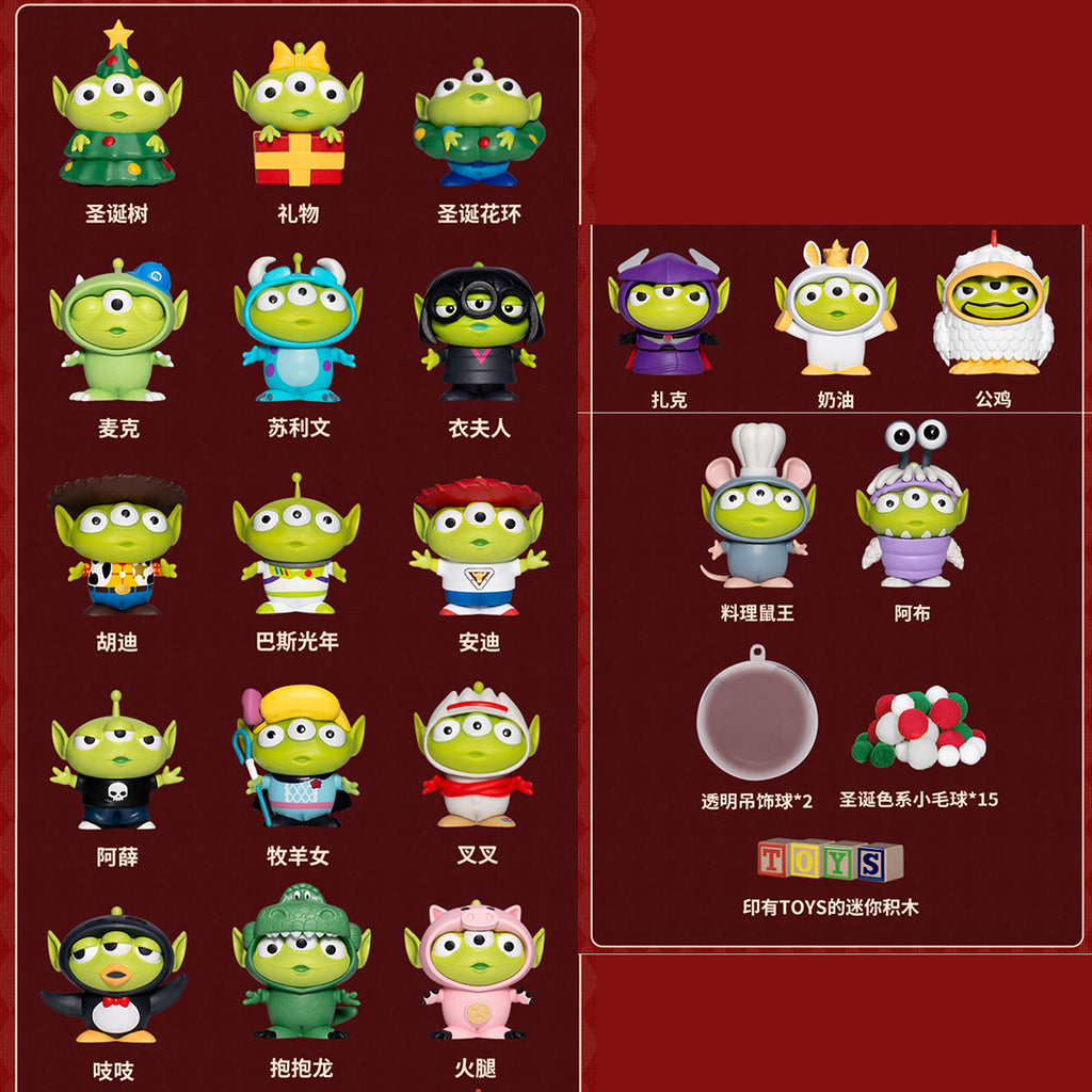 - Contents include: 20, 3cm three-eyed alien figurines in disguise (including three new Christmas-themed designs). two transparent hanging ornaments. 15 Christmas-colored mini pompoms. mini blocks labeled "TOYS". Recommended for ages 15+ & up.