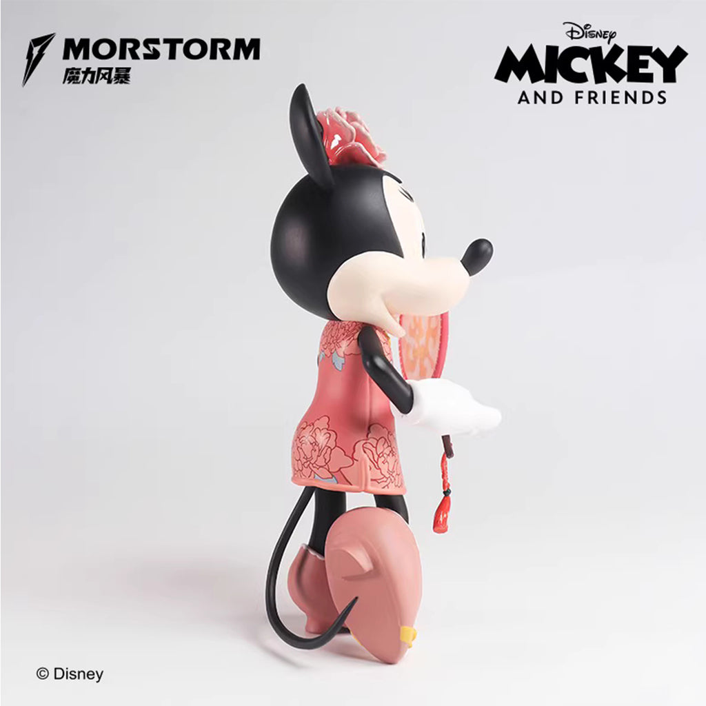 • Minnie reimagined in a pink cheongsam (qipao) blends classic Eastern silhouette with contemporary designer aesthetics for a standout collectible.