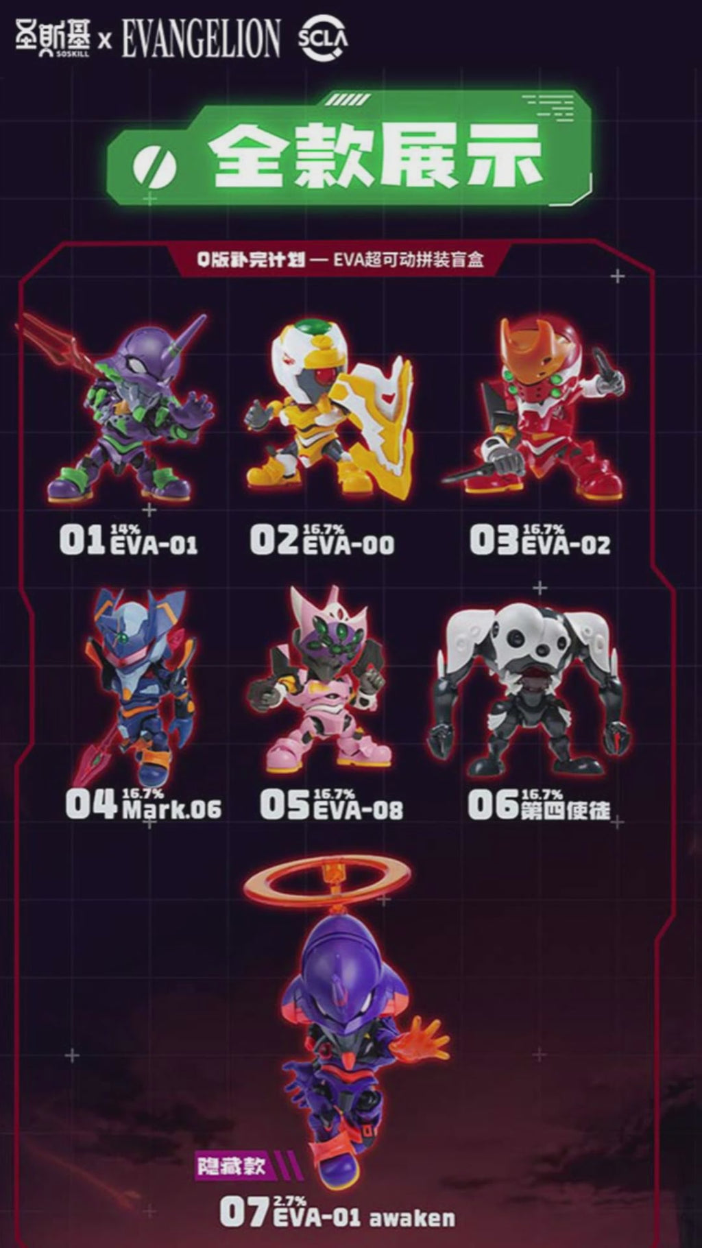 PDQ Display Box: The set includes 6 individual boxes. Unit-01 and Unit-01 Awakening (Hidden Version) are randomly included at a 1/36 probability. Sets containing the Hidden Version will have Unit-01 removed, while other units remain unchanged.