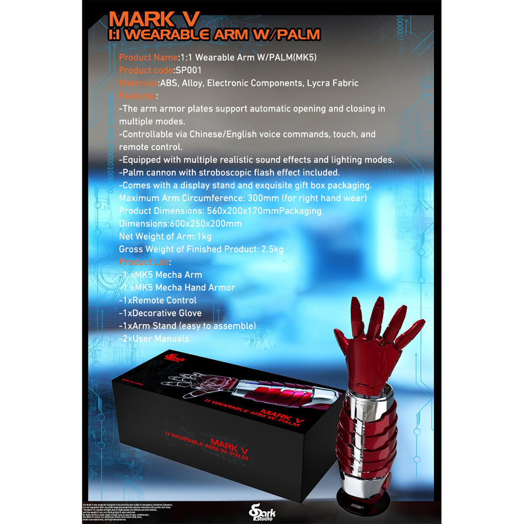 - Specifications: Maximum Arm Circumference: 300mm (for right hand wear). Product Dimensions: 560x200x170mm. Packaging Dimensions: 600x250x200mm. Net Weight of Arm: 1kg. Gross Weight of Finished Product: 2.5kg. Materials: ABS, Alloy, Electronic Components, Lycra Fabric. Recommended for ages 15 & up.