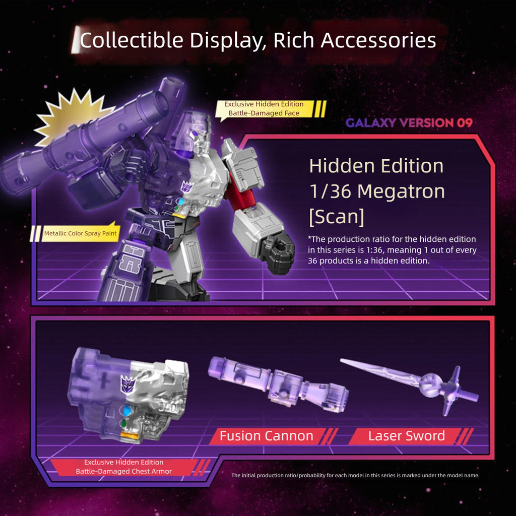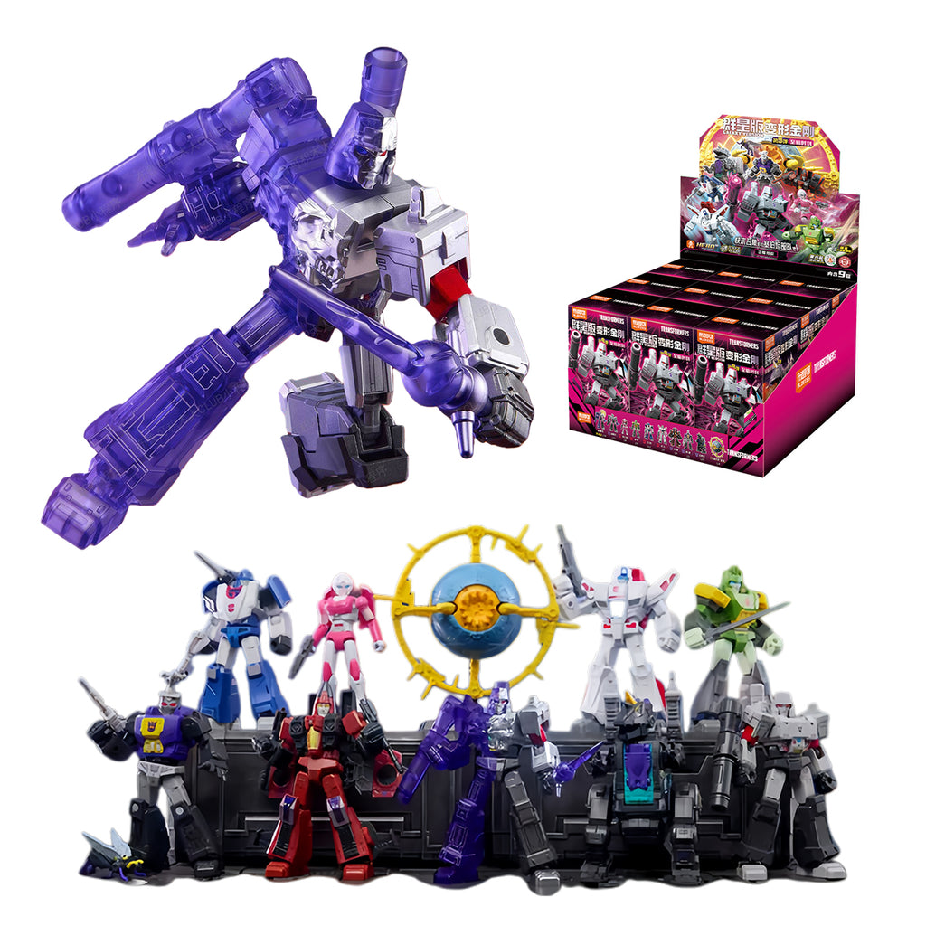 - Box Content: Megatron, Arcee, Springer, Mirage, Skyfire (Jetfire), Warpath, Bomb (Bombshell), Grimlock, Unicron (the planet Unicron). PDQ Display Box: Regular Figures * 6 (Ratio 1:9 to 1:12), Hidden Figure * 1 (Ratio 1:36).