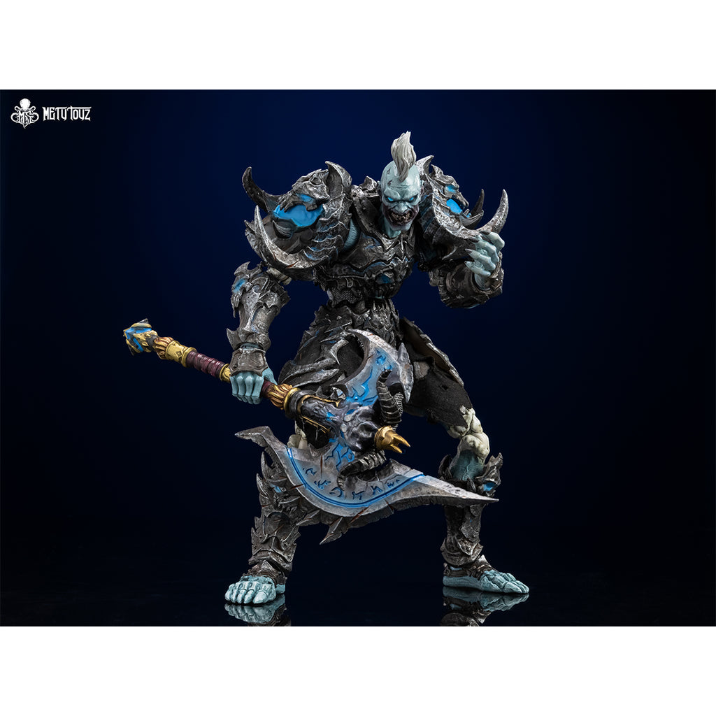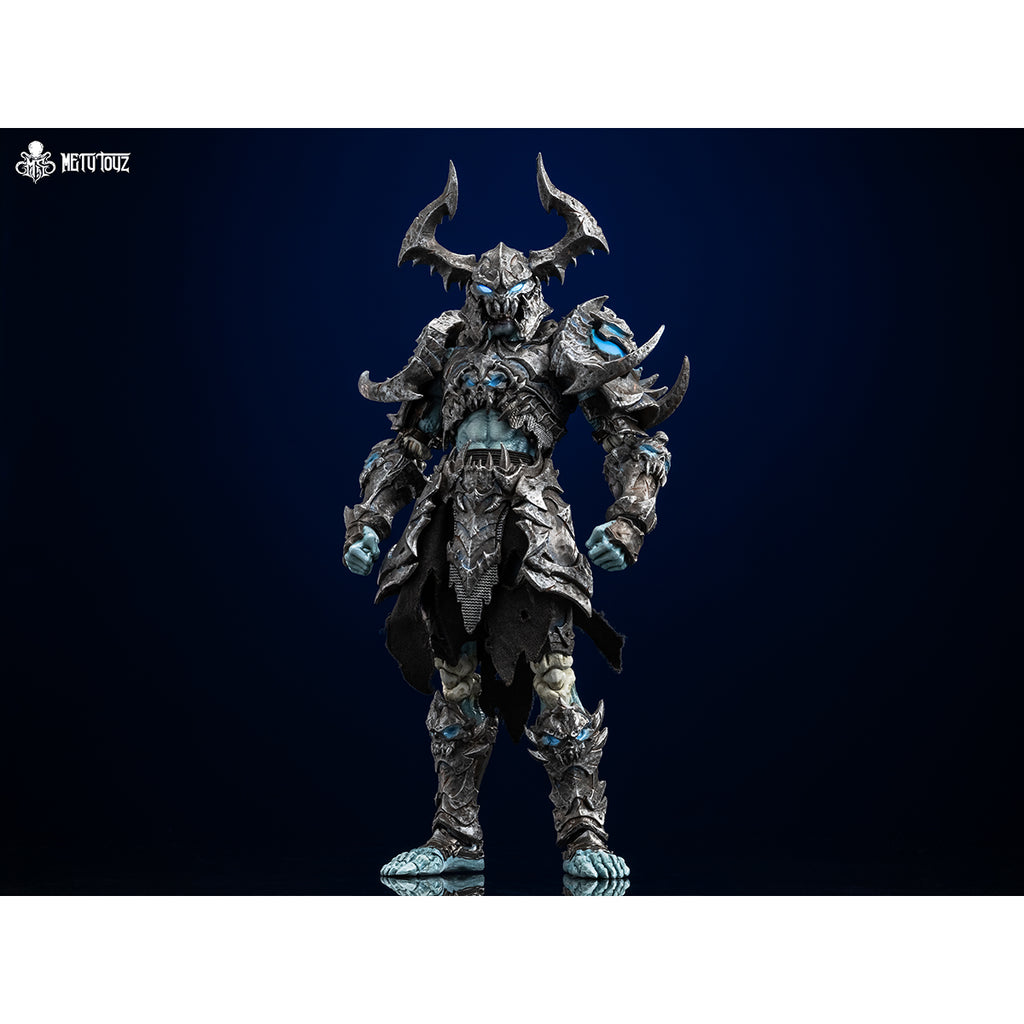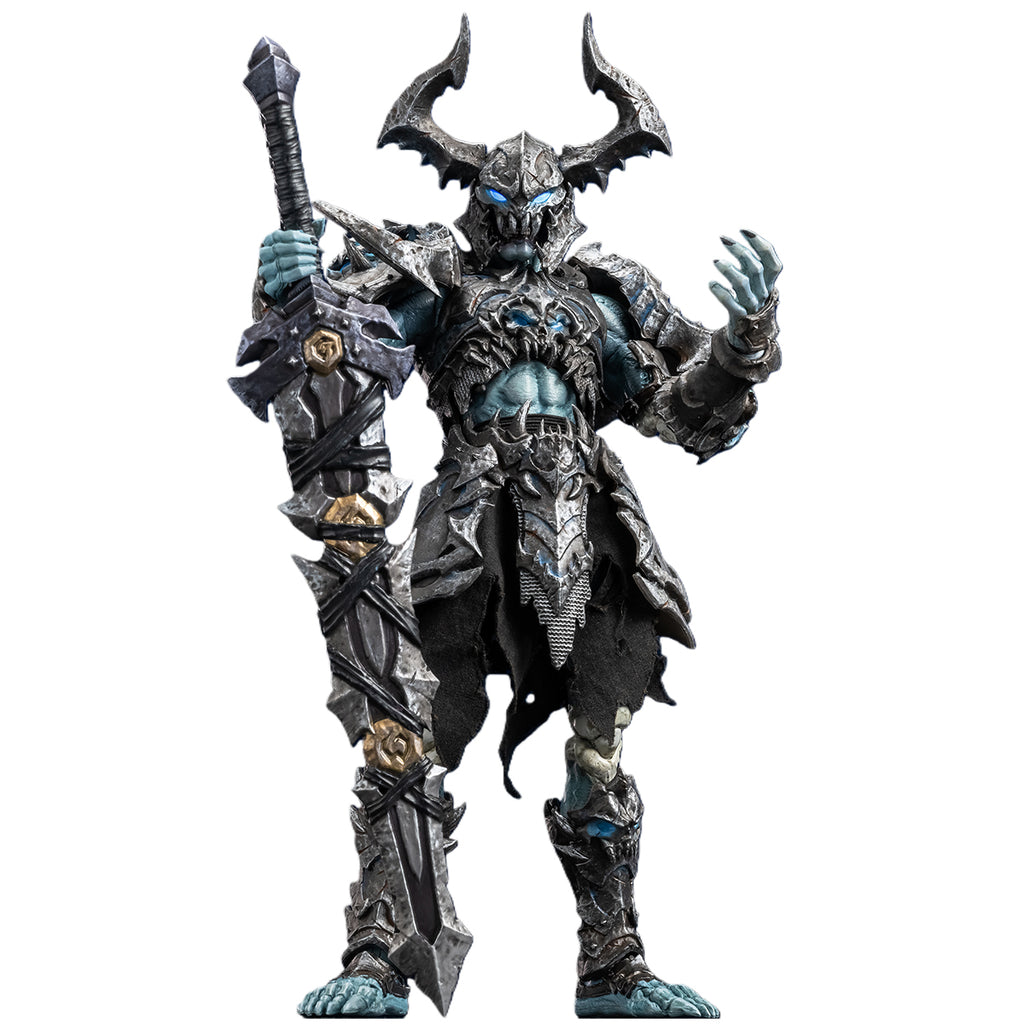 - Striking visual design — Frost‑hardened bone armor, heavy black ice plating and hollow sockets with a ghostly blue soul flame create a chilling, cinematic silhouette and rich textural details.