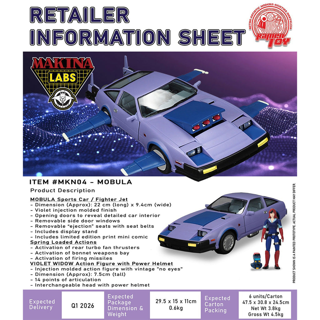 - MOBULA Sports Car / Fighter Jet: Dimension (Approx): 22 cm (long) x 9.4cm (wide). Purple injection molded finish. Opening doors to reveal detailed car interior. Removable side door windows. Removable “ejection” seats with seat belts. Includes display stand. Includes limited edition print mini comic.