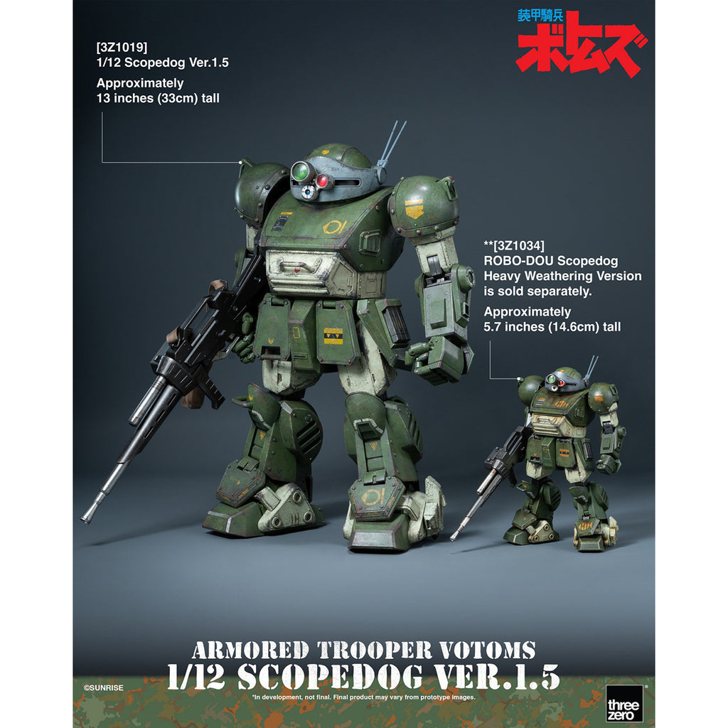 - From the animation Armored Trooper VOTOMS, threezero proudly present the 1/12 Scopedog Ver.1.5! Compared with the initial 1/12 Scopedog which was released in 2017, this Ver.1.5 features new paint applications as well as upgraded joint structures. Approximately 13” (33cm) tall fully articulated figure with approximately 100 points of articulation, including the fully articulated finger joints.