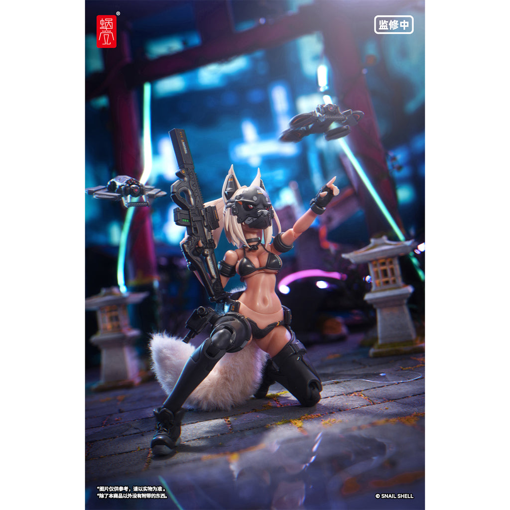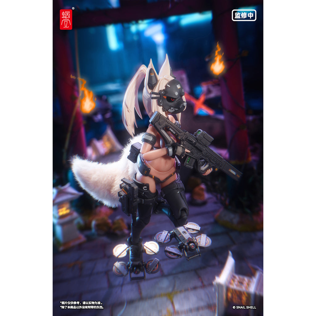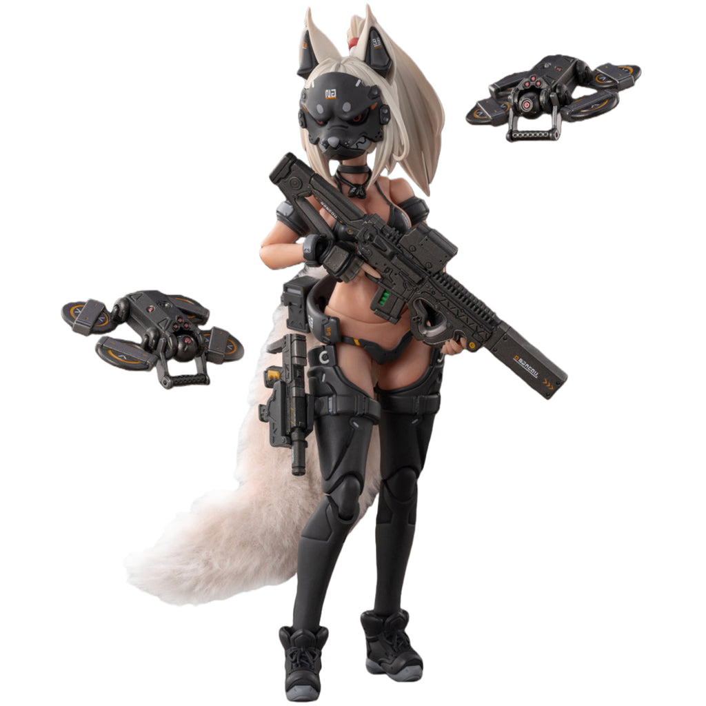 - Two face plates (smiling and open-mouth) with fully movable eyeballs—gaze can be adjusted using the included Mini Tool NEO; replacement bangs include a fox-shaped tactical mask that glows under black light.